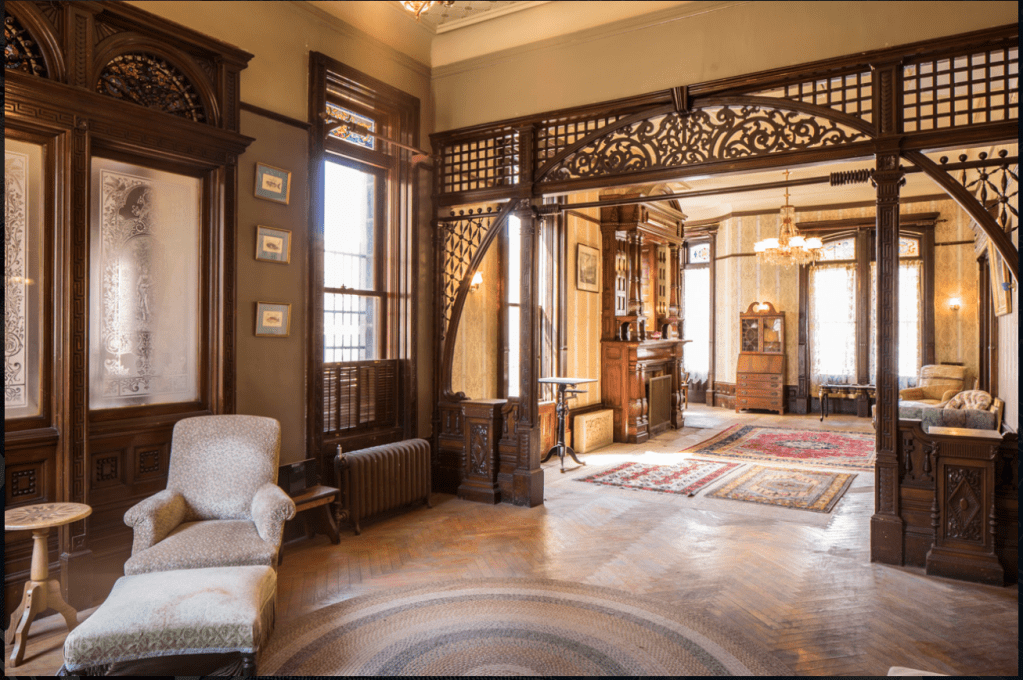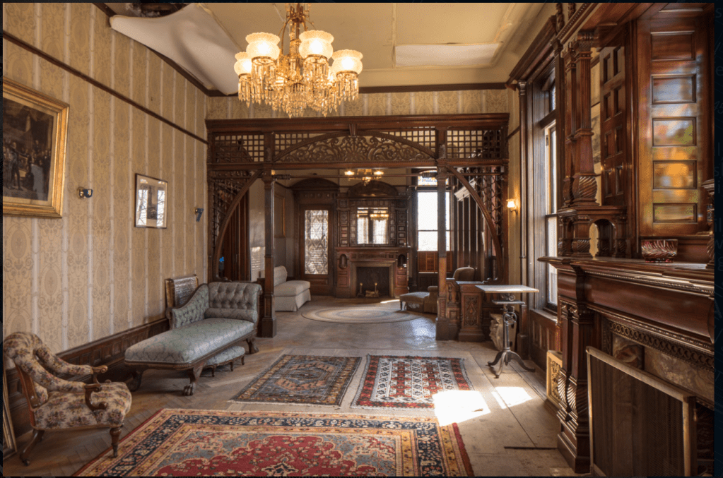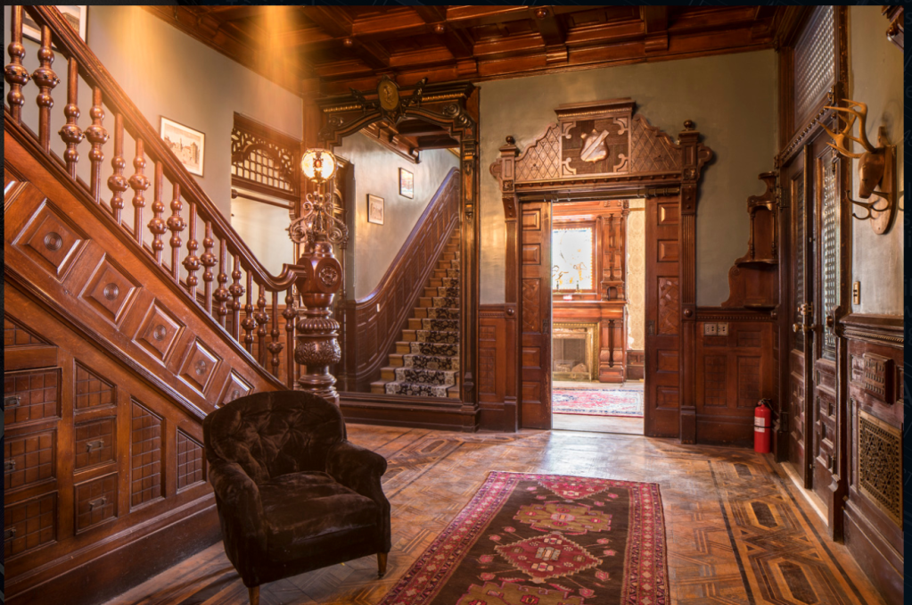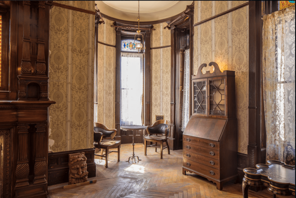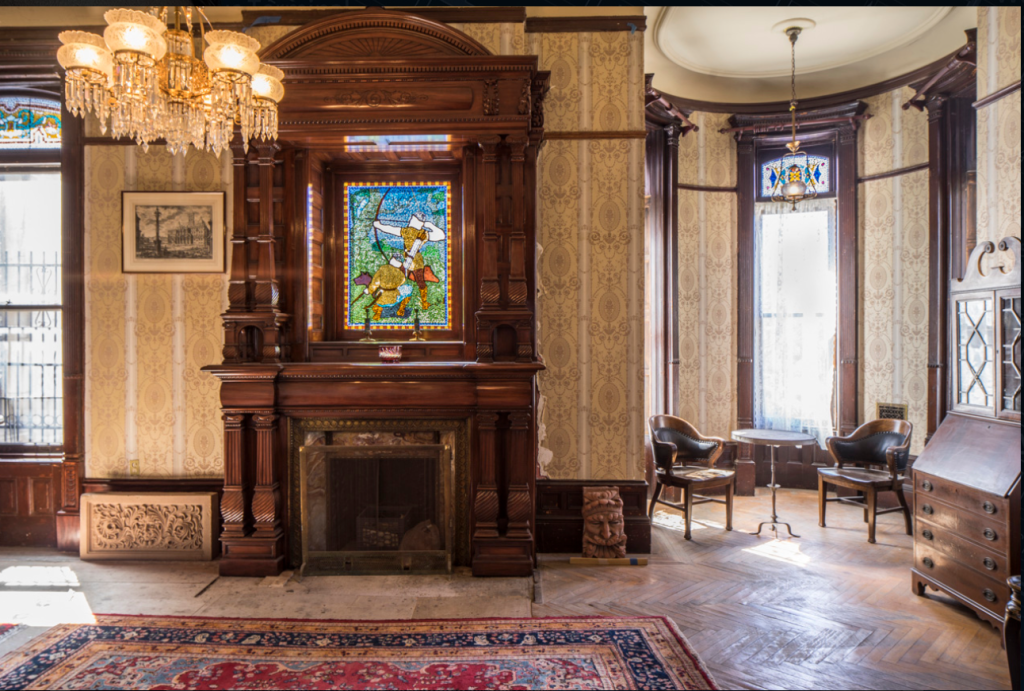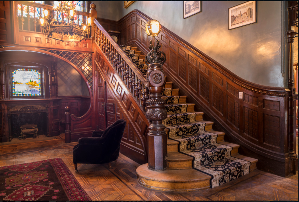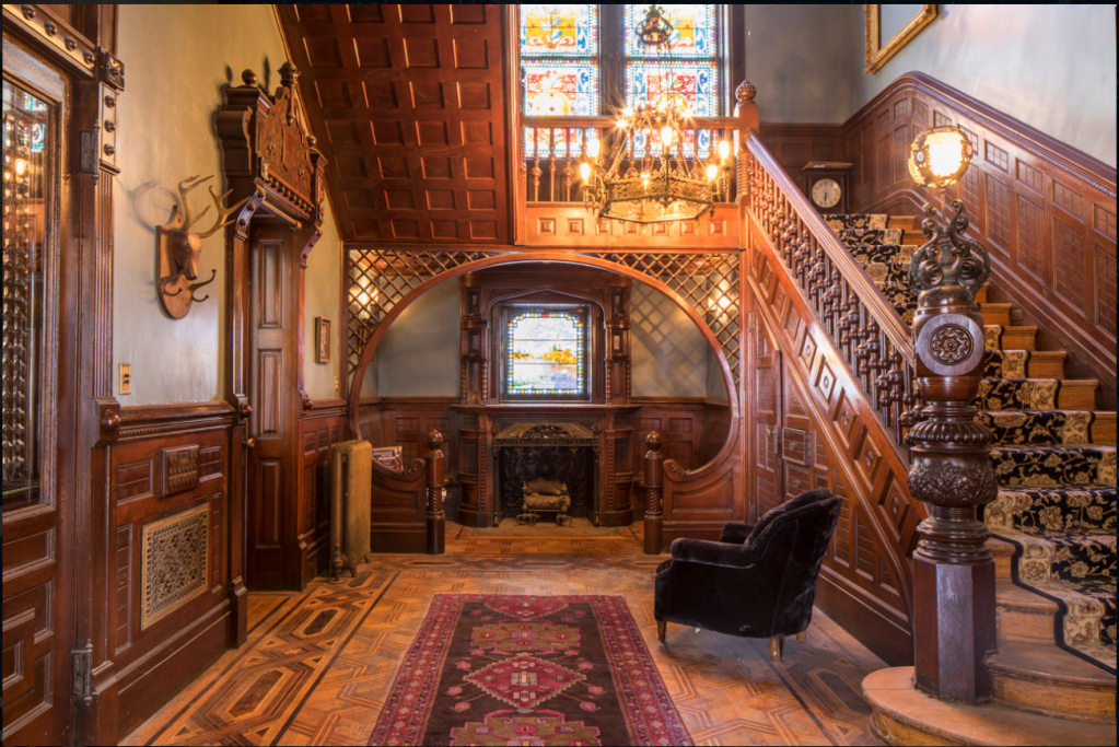 Limestone exterior, Romanesque Revival style interior with Medieval elements
