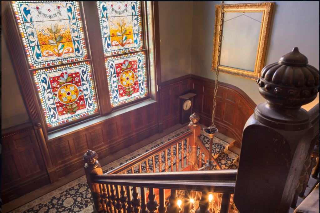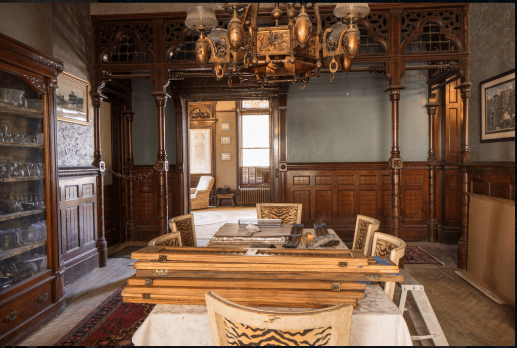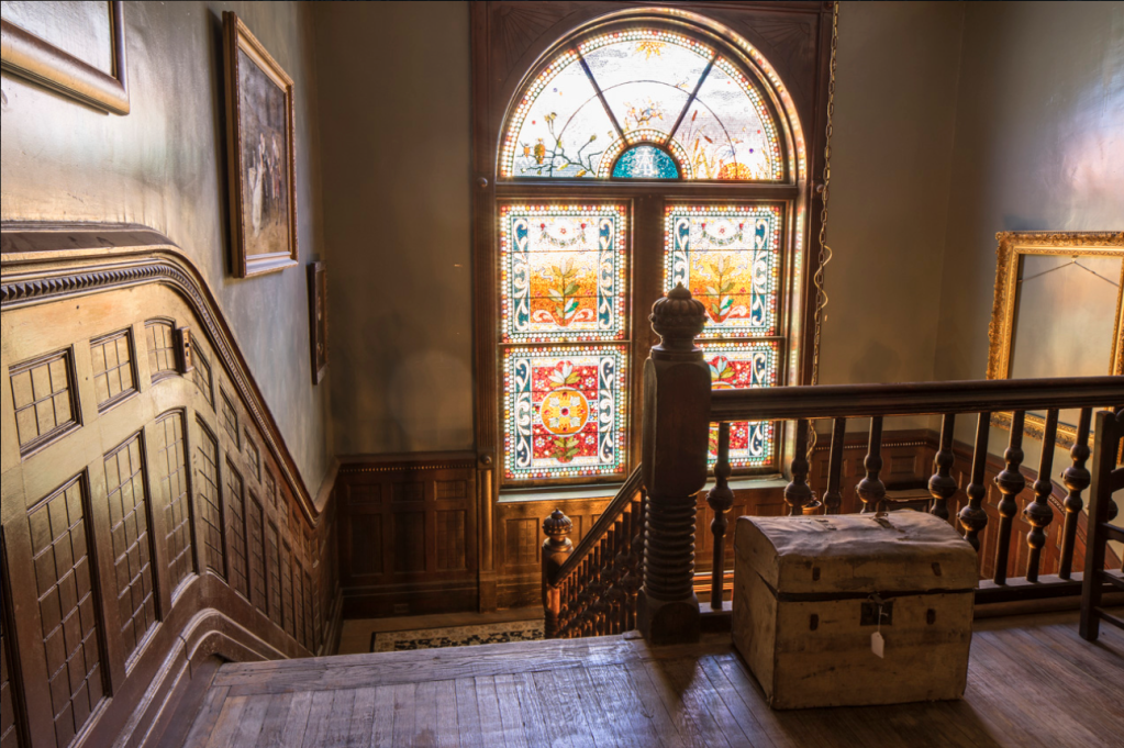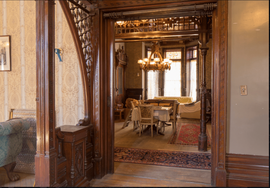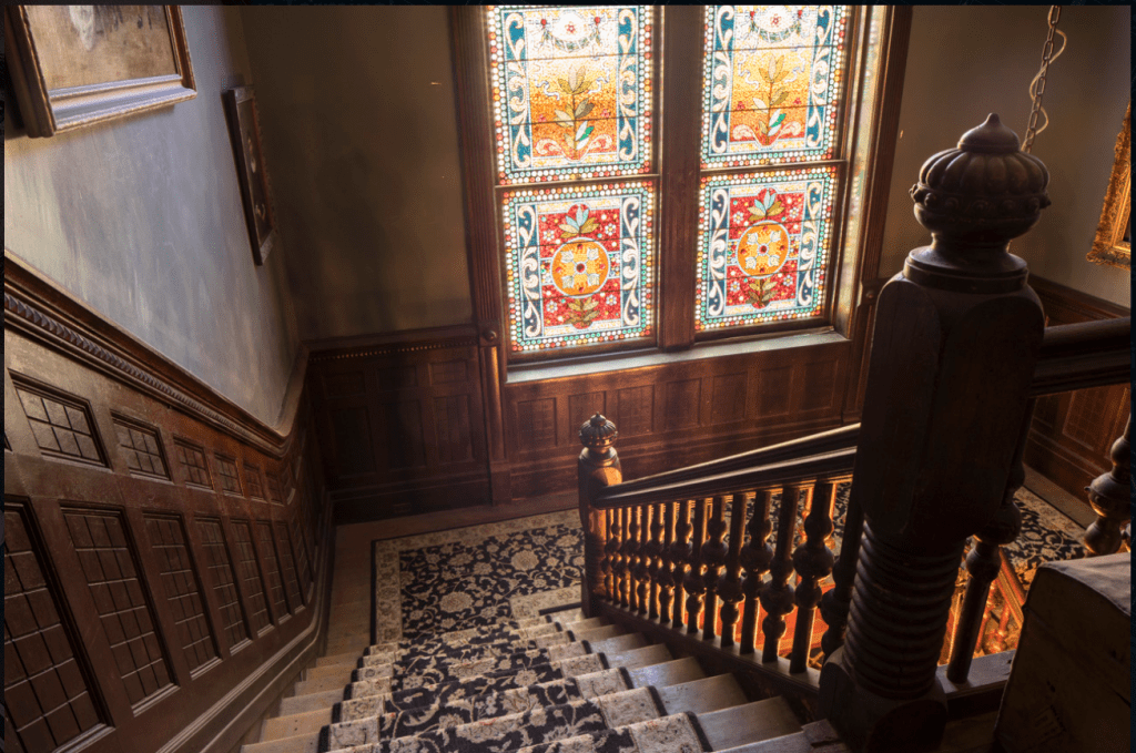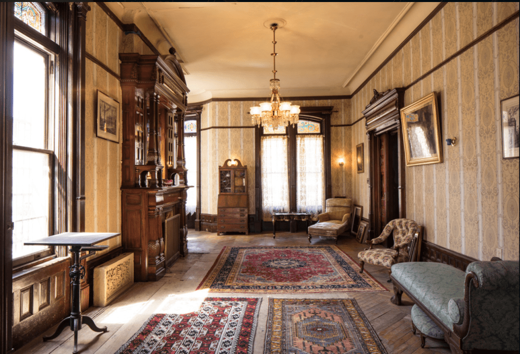 Limestone exterior, Romanesque Revival style interior with Medieval elements