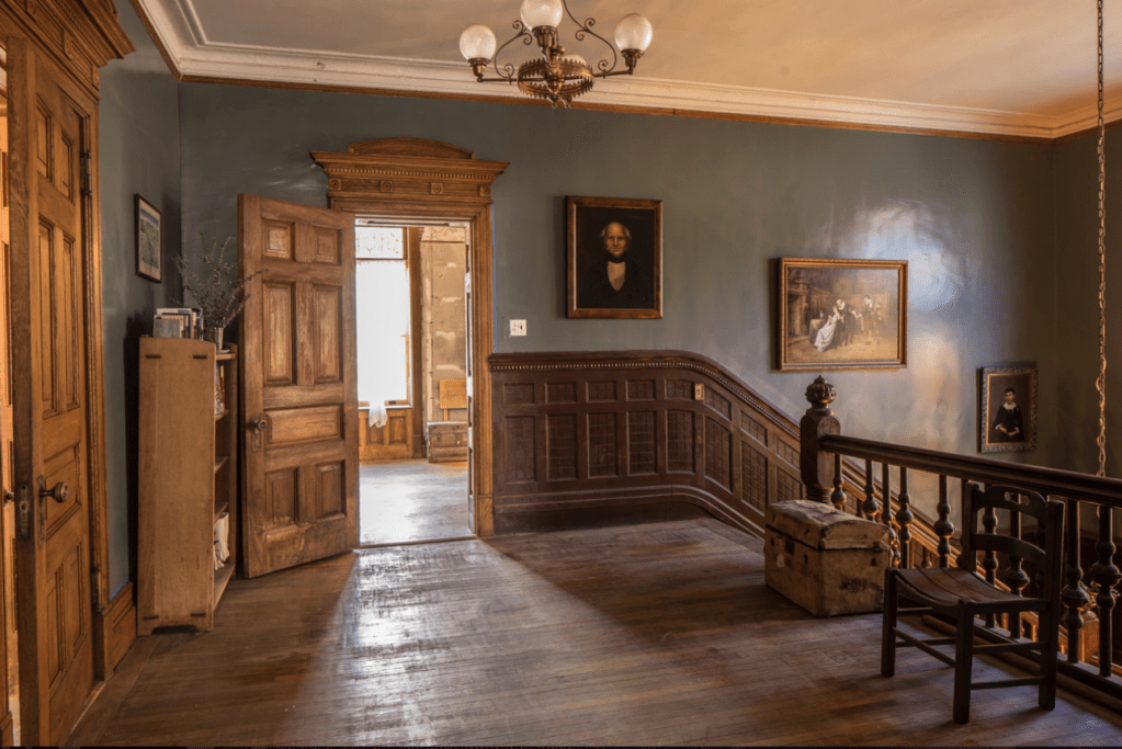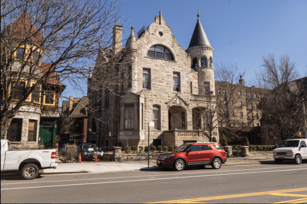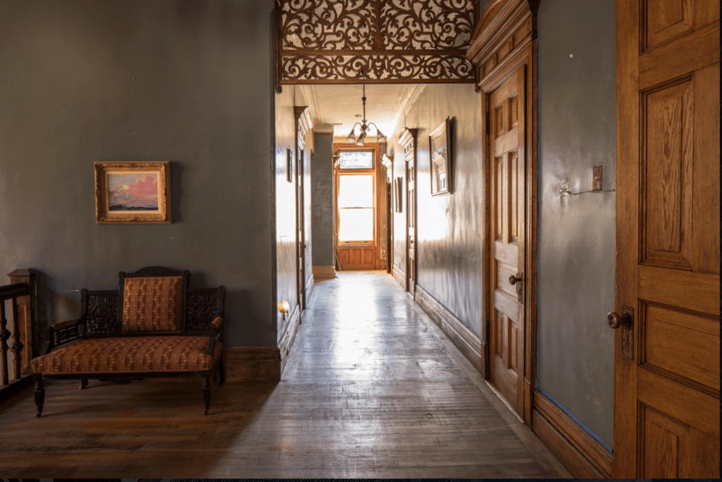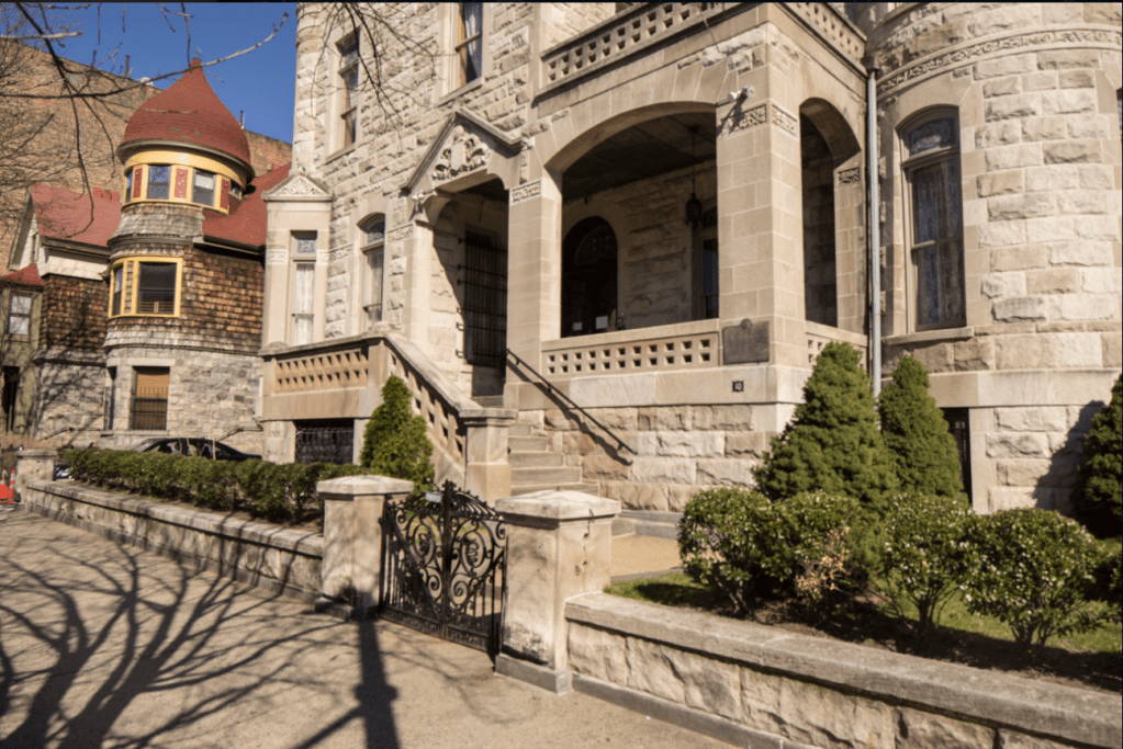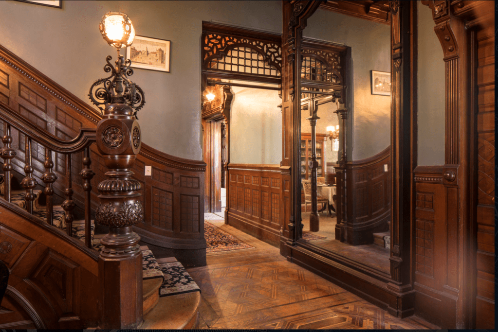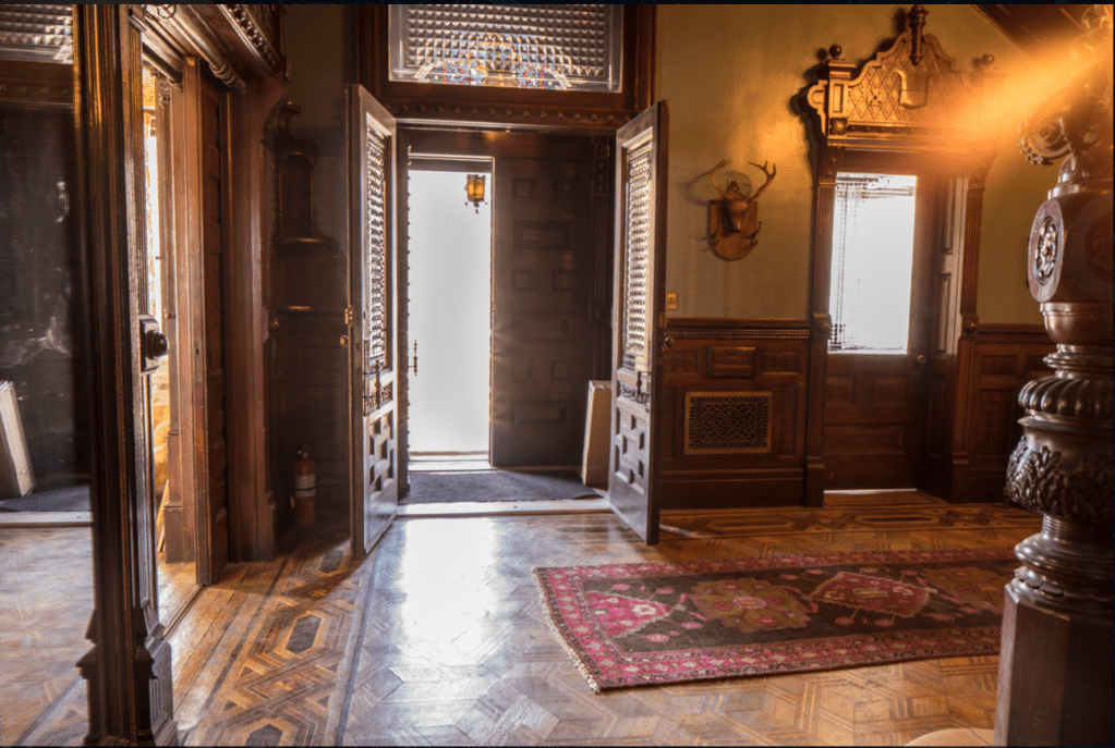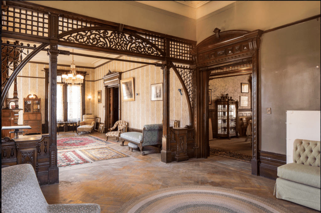 Limestone exterior, Romanesque Revival style interior with Medieval elements
