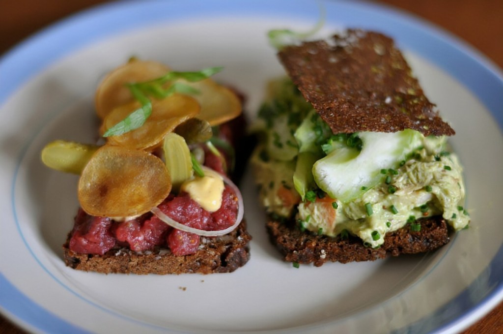 - Smørrebrød: These open-faced sandwiches are a staple and come topped with ingredients like pickled herring, roast beef, or shrimp with dill.