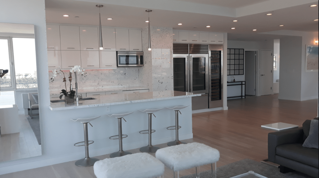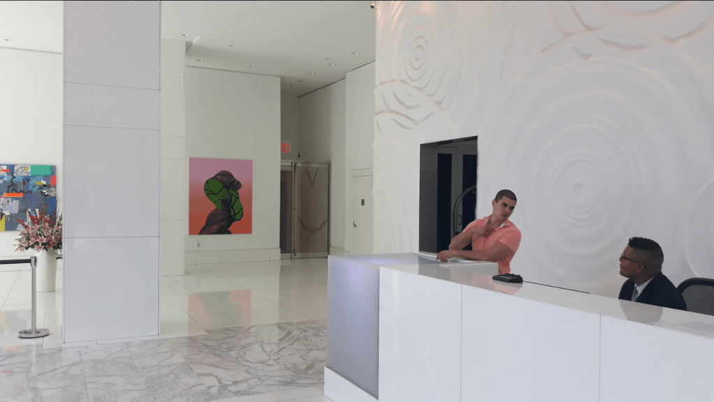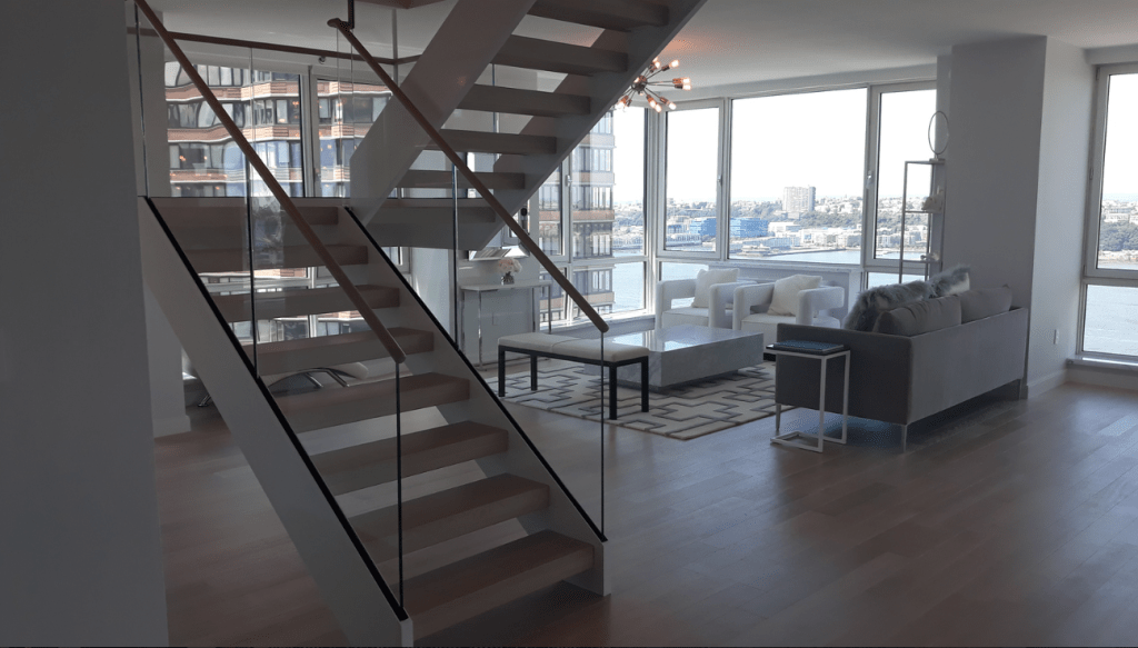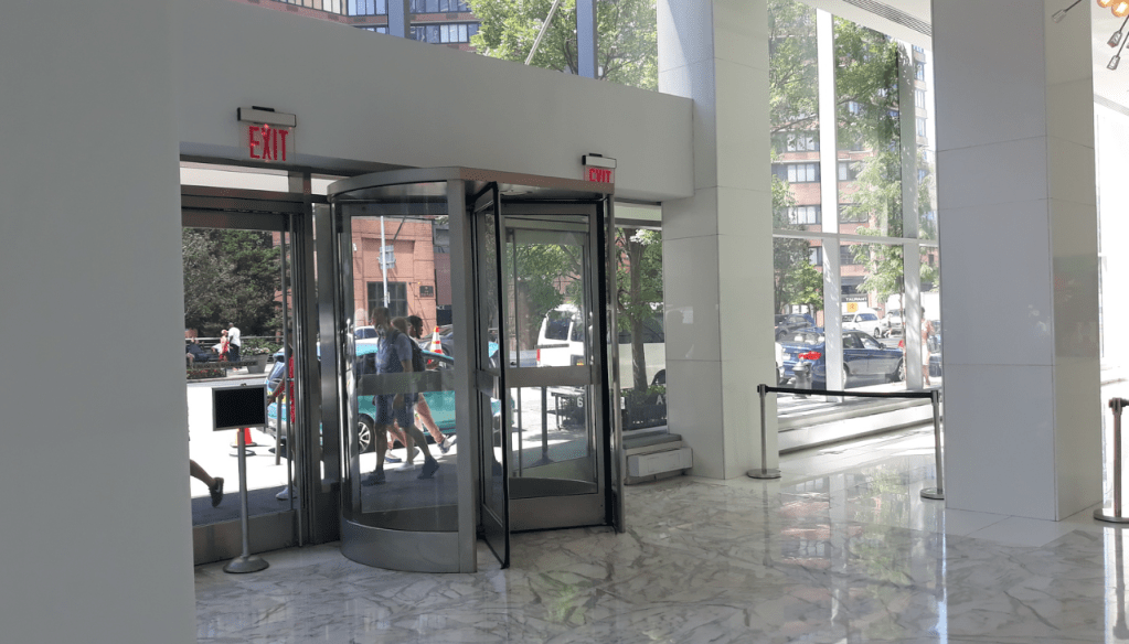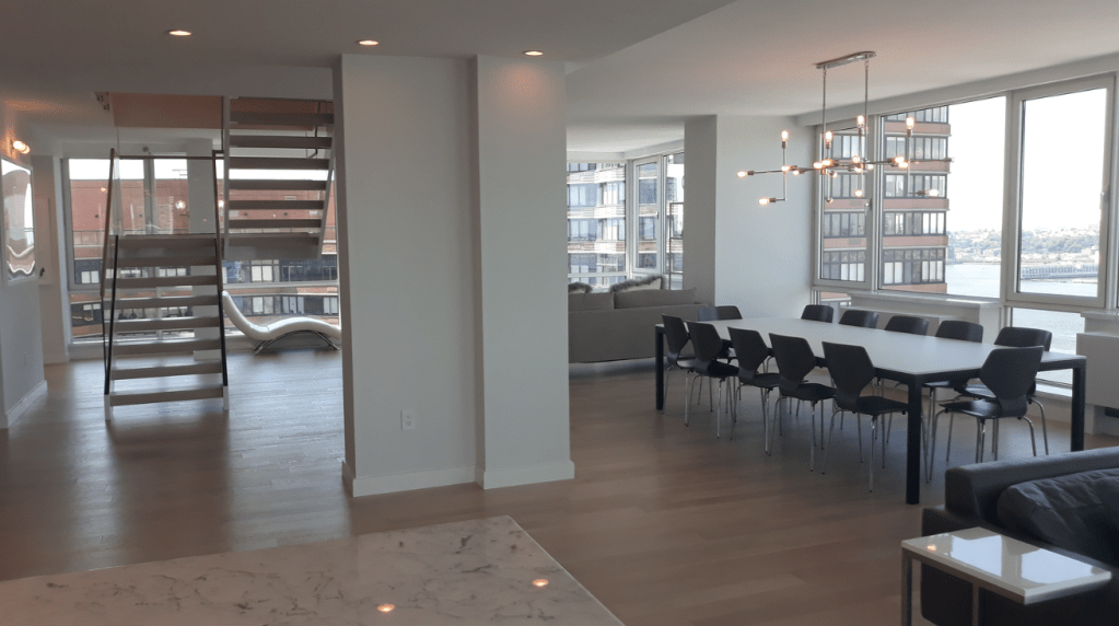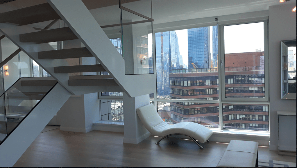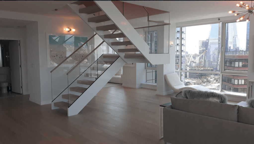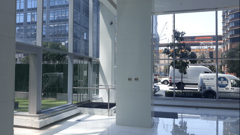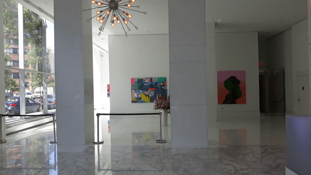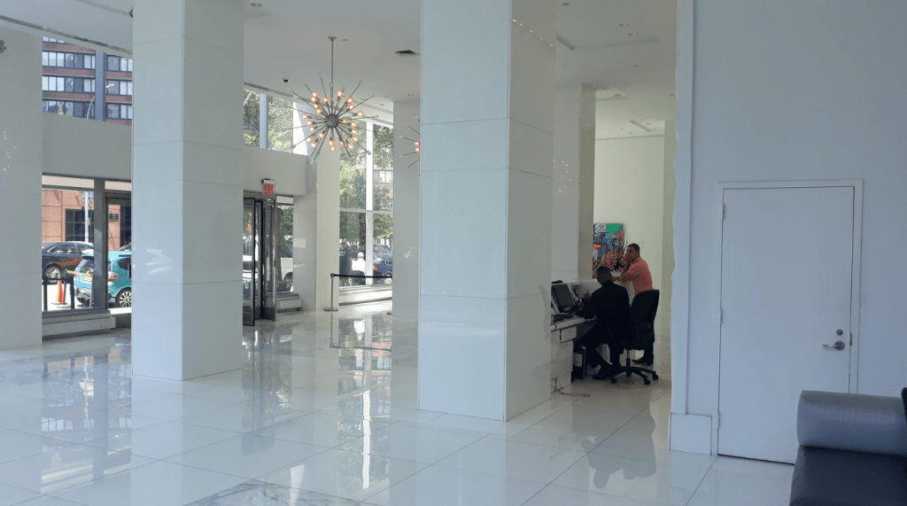 635 Duplex Condo High end, upscale Manhattan contemporary High-rise, big windows, white walls, wooden floors, building Lobby with marble floors