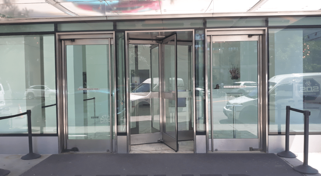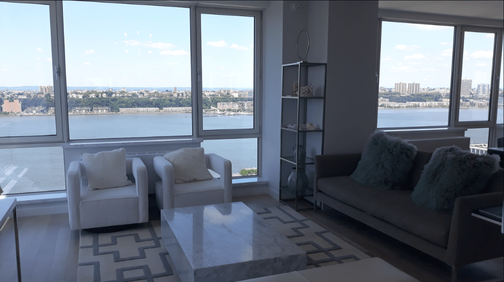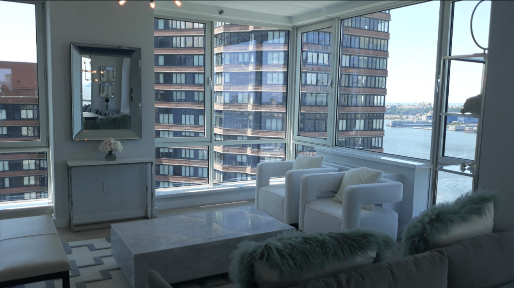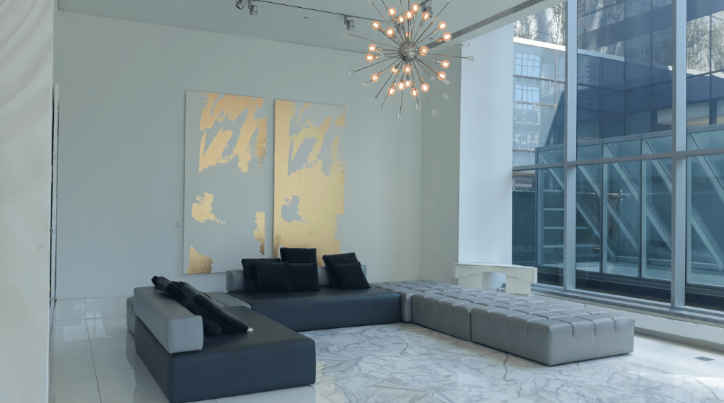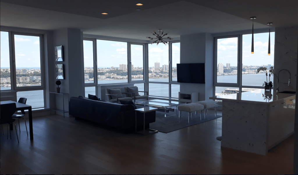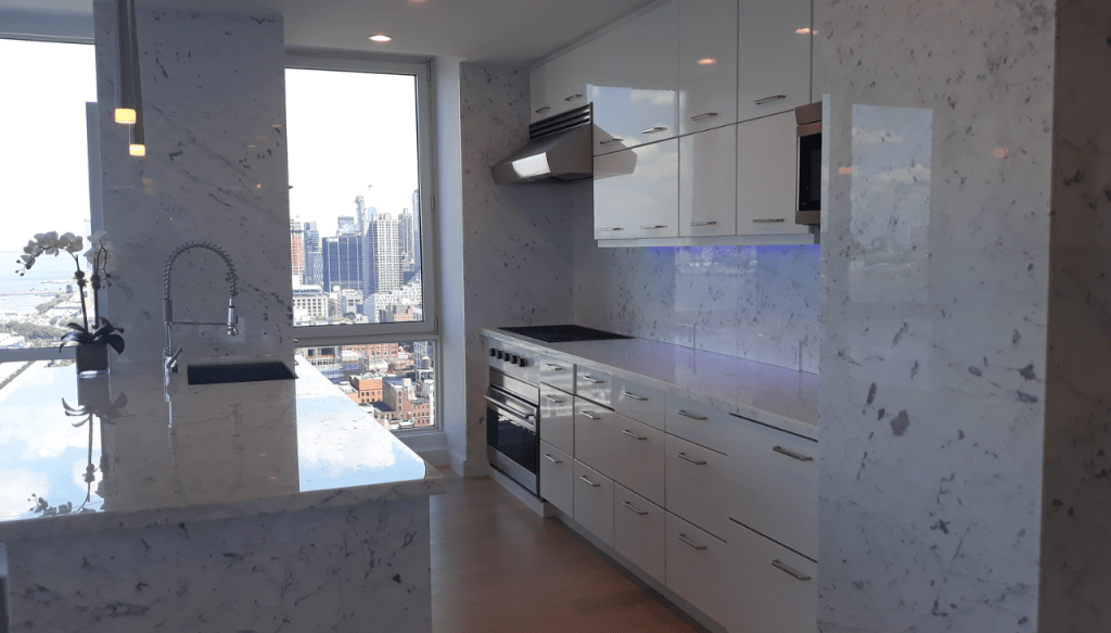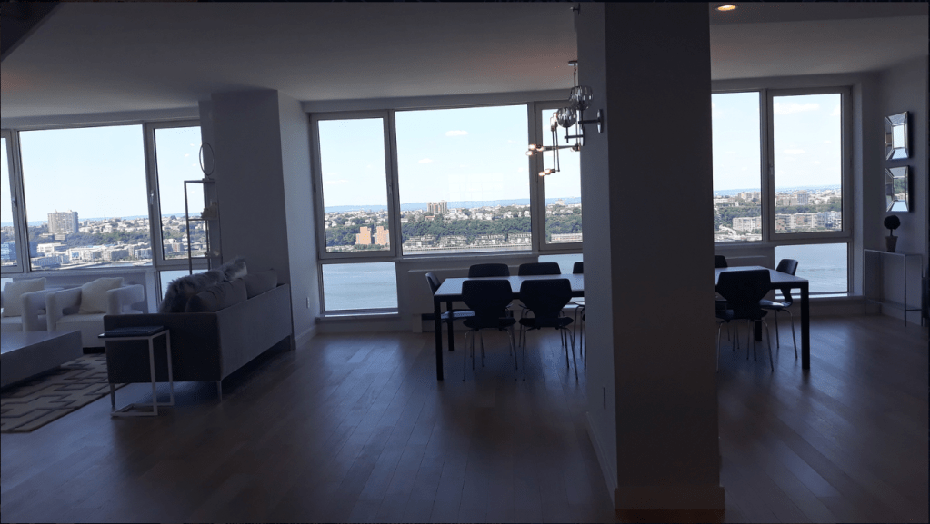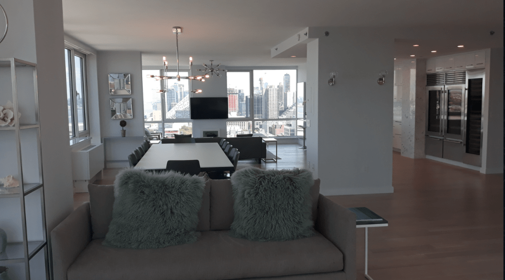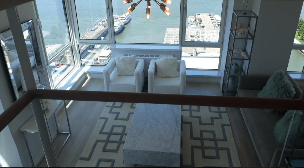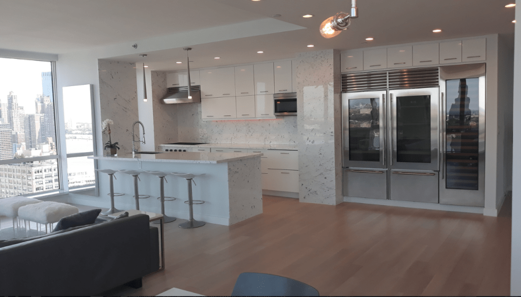 635 Duplex Condo High end, upscale Manhattan contemporary High-rise, big windows, white walls, wooden floors, building Lobby with marble floors